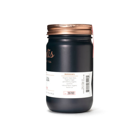Jars contain 15 biodegradable pyramid tea bags in a powder coated glass mason jar.