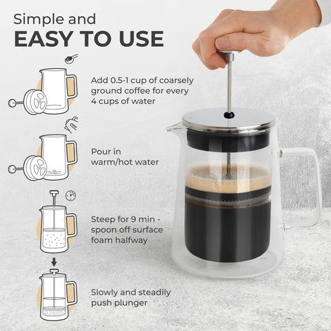 ♨️ High Heat Capacity Borosilicate Glass – Double wall insulation made from heat-resistant borosilicate glass keeps your coffee warm longer than regular presses.