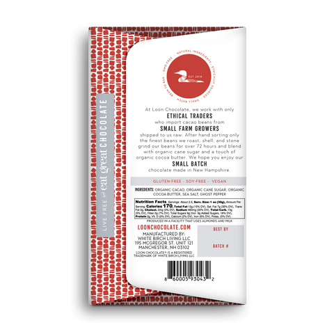 70% Dark Chocolate sprinkled with Ghost Pepper powder and organic Maine sea salt. 100% ethically sourced and organic, our cocoa beans are dried & fermented on-site prior to shipping to maximize the flavor profile.