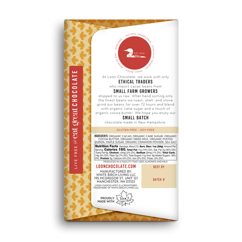 Maple and Chocolate - The perfect combination!! Teaming-up with NH's Premier Maple Syrup producer "Ben's Sugar Shack" (www.benssugarshack.com), our newest chocolate creation combines Loon Chocolate's award-winning Milk Chocolate with Maple Sugar, Salt, Cinnamon & toasted organic quinoa for a wonderful crunch in every bite!